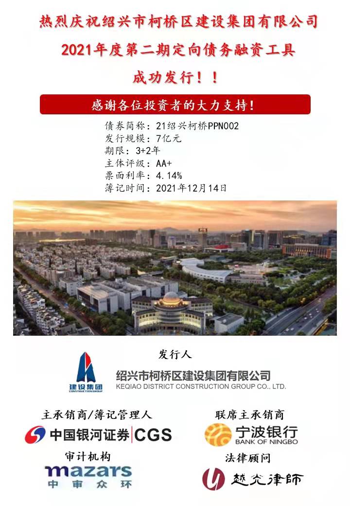 12月14日,紹興市柯橋區(qū)建設(shè)集團有限公司2021年第二期定向債務(wù)融資工具成功簿記建檔,規(guī)模7億元,期限3+2年,AA+主體無擔(dān)保,票面利率4.14%。