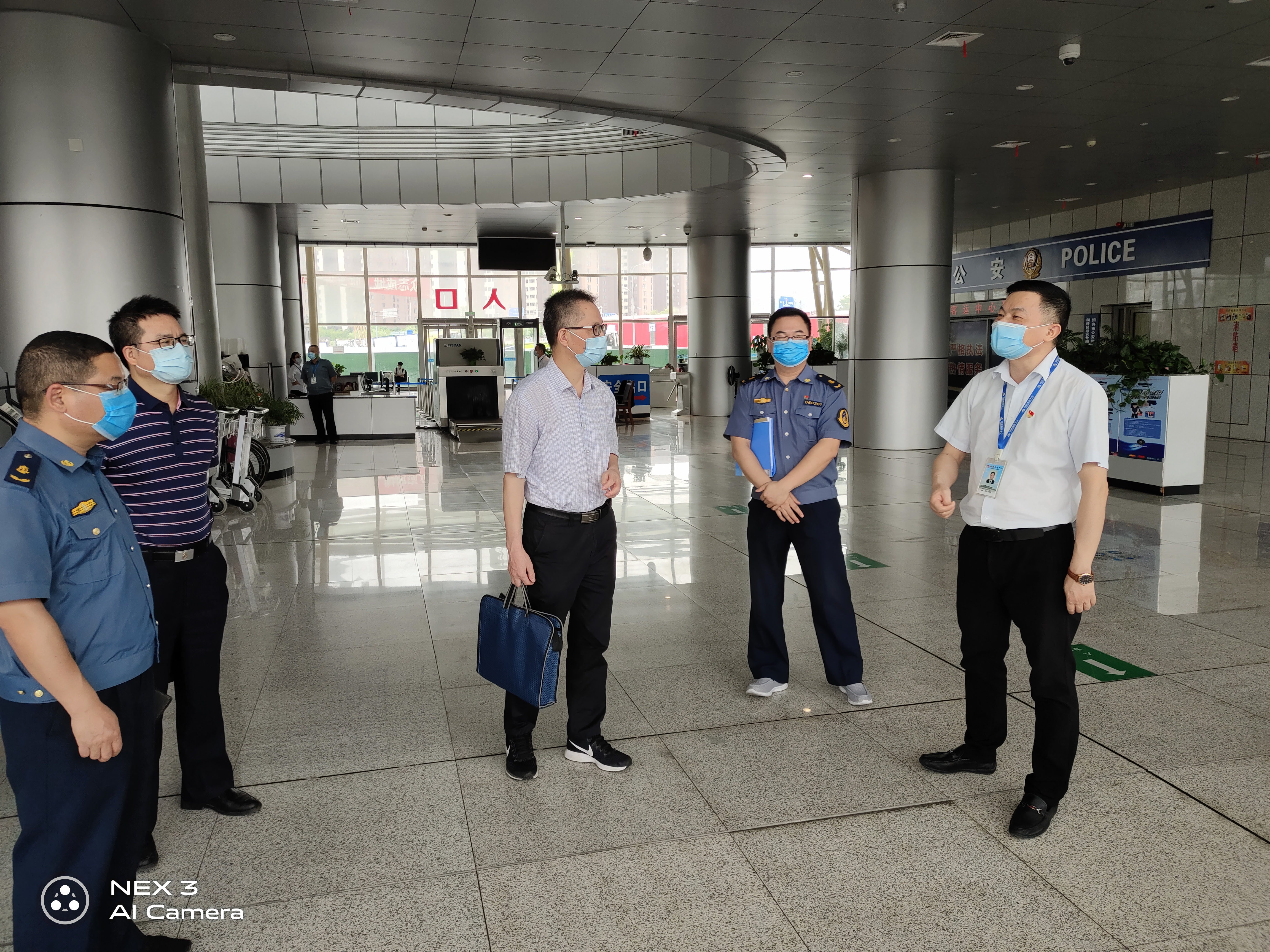 5月22日中午11點(diǎn),浙江省公路與運(yùn)輸管理中心處長(zhǎng)錢樟久等一行三人在紹興市道路運(yùn)輸管理局副局長(zhǎng)何益忠、柯橋區(qū)道路運(yùn)輸管理處副主任朱新剛的陪同下蒞臨客運(yùn)中心視察反恐安保工作,中心總經(jīng)理蘆紅偉及副總經(jīng)理鄭宜迎接檢查。