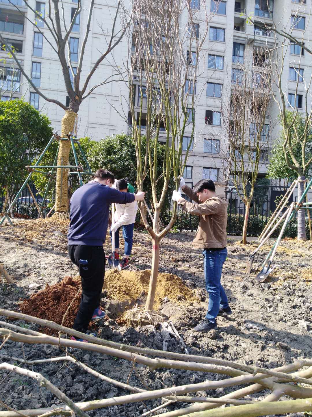 雖是春寒料峭,但植樹活動現(xiàn)場卻呈現(xiàn)出一派熱火朝天的景象,大家分工明確,密切配合,有的揮鍬鏟土、有的扶樹填土、有的培土澆木,忙的不亦樂乎。經(jīng)過一個多小時的勞動,紫薇、茶花、桂花、蠶絲海棠等100余株樹苗在周邊綠化帶里“安家落戶”,為時尚紡城再添新綠。