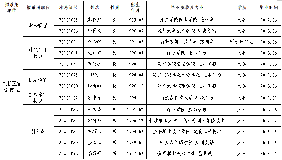 紹興市柯橋區(qū)建設(shè)集團(tuán)有限公司擬錄用人員公示